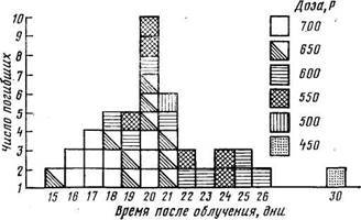 Как правило, молодняк погибает в более ранние сроки после облучения в летальных дозах: смертность животных обычно отмечается на 13—18-й день. Для всех возрастных групп животных, облученных в летальных дозах, характерна более ранняя гибель при наиболее высоких дозах радиационного воздействия (рис.). Однако это явление можно расценивать скорее как тенденцию, чем закономерность, так как имеется достаточно много экспериментальных данных о ранних сроках гибели животных при облучении их сравнительно невысокими дозами радиации.