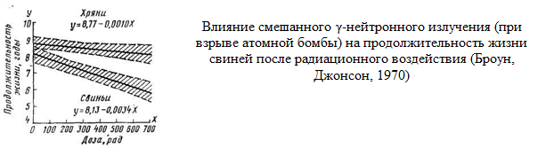Следует иметь в виду, что при фракционированном облучении сроки гибели животных зависят прежде всего от мощности дозы. Так, при ежедневном облучении ослов в дозе 400 Р все животные погибали между 5-м и 10-м днями. В экспериментах, где доза ежедневного облучения составляла 50 и 25 Р, средняя продолжительность жизни после начала радиационного воздействия составляла соответственно 30 и 63 дня. Кроме того, на продолжительность жизни сильно влияют видовые особенности животных. При фракционированном ежедневном облучении свиней в дозе 50 Р средняя продолжительность жизни у них оказалась равной 205 дням, что в 6,4 раза превышало среднюю продолжительность жизни ослов при тех же условиях радиационного воздействия.