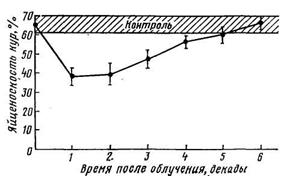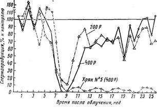 Половые железы животных отличаются высокой чувствительностью к действию ионизирующих излучений. При облучении самцов сублетальными дозами происходит лучевое поражение семяродного эпителия в семенных канальцах, а также сперматогониев и сперматоцитов; созревшие и сформированные сперматозоиды считаются радиорезистентными. Высокие дозы радиации вызывают почти полное уничтожение семяродного эпителия и последующее затухание спермопродукции, тогда как облучение самцов средними и низкими дозами вначале приводит к снижению сперматогенеза, а затем отмечается постепенное его восстановление (рис.). Весьма характерны уменьшение объема эякулята, снижение концентрации и подвижности спермиев в эякуляте, появление в большом количестве уродливых сперматозоидов, падение биологической полноценности спермы и ее оплодотворяющей способности. Кроме того, уменьшается масса семенников: при γ-облучении хряков в дозе 400 Р масса тестикулов снизилась на 30%, а при облучении петушков в дозе 500 Р она уменьшилась в 3 раза по сравнению с массой семенников у контрольных петушков.