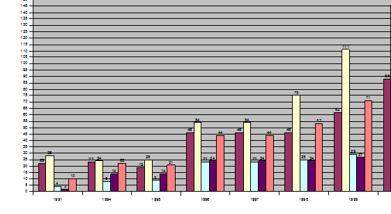 | 1999 | 32,9 | 34,8 | -1,9 | 25,2 | 26,7 | -1,5 |