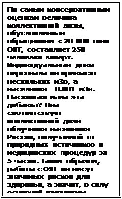 Переработка ОЯТ. Облучение персонала и населения при переработке ОЯТ во многом зависит от совершенства технологии переработки. Оценки, выполненные в консервативном предположении о том, что будут использоваться технологии не лучше уже существующих в России (хранение и переработка на РТ-1), дали суммарную коллективную дозу, связанную с переработкой и хранением ОЯТ, в пересчете на 20 тыс. тонн ОЯТ, порядка 200 чел.Зв, что составляет 0.01 чел.Зв на тонну ОЯТ. Большая ее часть приходится на переработку ОЯТ.