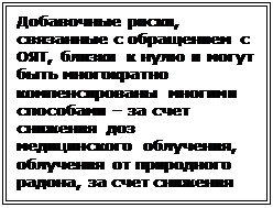 Величины радиационных рисков, связанных с дополнительным облучением персонала и населения от нормально функционирующих производств современной атомной энергетики, пренебрежимо малы в сравнении с рисками от других производственных отраслей, включая энергетику, транспорт, химическую, металлургическую и другие важные отрасли промышленности. При этом уровни облучения подавляющей части персонала и всего населения находятся в области сверхмалых доз, риск вредности которых не только предельно мал, но и прямо не доказан, т.е. является гипотетическим.