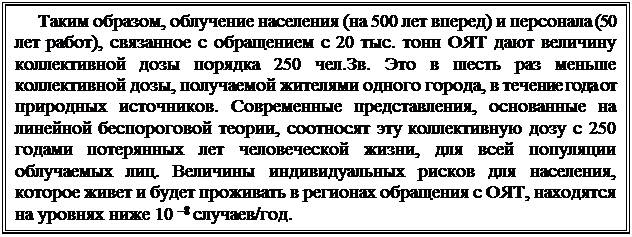 Аналогичные результаты были получены экспертами ОЭСР. Дополнительная коллективная доза облучения населения за 500 лет, проживающего в зоне влияния заводов по переработке ОЯТ в Ла Гаге (Франция) составляет 1.2 чел. Зв/ГВт.год. При переработке 20000 т ОЯТ на этом заводе коллективная доза населения составит около 650 чел. Зв (с учетом высокой плотности населения в Европе). Фактические дозы облучения населения вблизи этого завода, перерабатывающего в год 1600 т ОЯТ, составляют 5 – 50 мкЗв/год, что соответствует пренебрежимо малым гипотетическим рискам смерти.