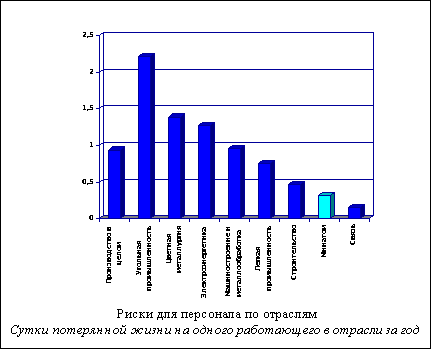 Важным интегральным критерием безопасности технологий является безопасность персонала травматизм от всех факторов и профессиональные заболевания. Анализ соответствующих данных показывает, что предприятия Минатома России являются одними из самых безопасных в России по данному критерию. Например, такой сводный показатель, как сутки потерянной жизни за год на одного работающего в отрасли, в Минатоме России в три раза ниже, чем в среднем по России, и более чем в два раза ниже, чем в легкой промышленности. Причем в показатель Минатома России наибольший вклад дают строительные подразделения предприятий. Роль радиационного фактора в этих потерях пренебрежимо мала.