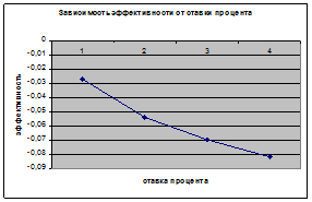 Судя по графику зависимости эффективности от ставки процента можно сказать, что эффективность падает при увеличении ставки процента, следовательно, здесь обратная зависимость.