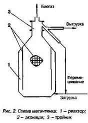Наиболее перспективной, сточки зрения получения агрохимической (производство удобрений), экологической (обеззараживание и дезодорация) и энергетической (производство топлива и электроэнергии) эффективности, является технология переработки навоза в анаэробных условиях в специальных герметичных реакторах — метантенках, выполненных, как правило, из металла. Благодаря деятельности метанообразующих бактерий в бескислородной среде при температуре 39...40 или 53...55°С в реакторе происходит процесс сбраживания навоза с образованием горючего газа, основными компонентами которого являются метан (60...65%) и углекислый газ (35...40%).
