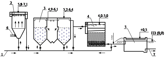 1 – подача исходной воды от НС-I; 2 – смеситель гидравлического типа; 3 – осветлитель с взвешенным осадком; 4 – скорый фильтр; 5 – резервуар чистой воды; 6 – ввод реагентов; 7 – подача воды потребителям.