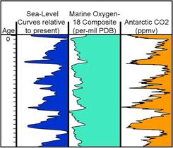 Климатические индикаторы за последние 0,5 млн лет: изменение уровня океана (синий), концентрация 18O в морской воде, концентрация CO2 в антарктическом льду. Деление временной шкалы — 20 000 лет. Пики уровня моря, концентрации CO2 и минимумы 18O совпадают с межледниковыми температурными максимумами.