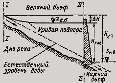. Разность уровней верхнего Zв.б. и нижнего Zн.б бьефов создает необходимый напор гидроэлектростанции Hгэс, при этом напор за счет кривой подпора будет несколько меньше того, который возможен при использовании рассматриваемого участка реки 1-2, т. е. Hуч. Величина