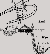 (на рис.), создающая небольшой подпор и сравнительно малое водохранилище, из которого через водоприёмник 2