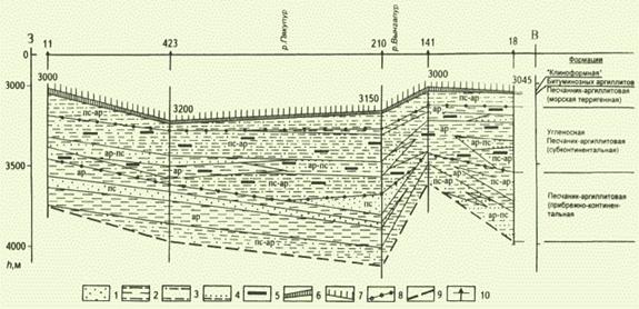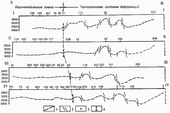 По профилю намечается определенная зональность в распределении и соотношениях литофаций (рис.1.1.1). Она проявляется на западе р. Вынгапур (около 76° в.д.) в виде относительно устойчиво чередующихся литофаций в разрезе, а восточнее - зоны выклиниваний и фациальных замещений. Эта «зона выклиниваний» отражается проявлением здесь конседиментационных деформаций поверхности седиментации.