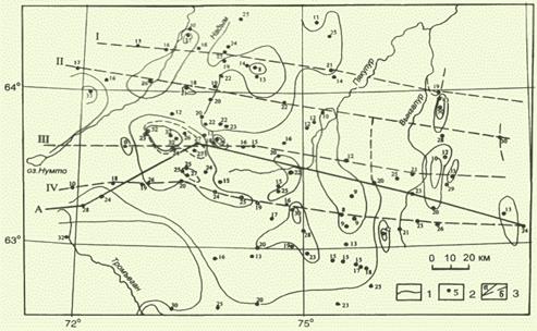 В районе Сибирских увалов состав баженовской свиты близок общему для Западной Сибири, но на локальных участках в верховьях рек Пим (Южно-Ватлорская площадь) и Тромъеган (Восточно-Перевальная и Конитлорская площади) на западе, а также в верховьях р. Аган (Тагринская площадь) - на востоке Сибирских увалов она имеет аномальный алеврито-песчаниковый характер, сходный с отложениями неокома. По результатам литолого-стратиграфических корреляций здесь выявлена и определенная закономерность региональных вариаций мощности баженовской свиты (рис.1.1.2): для бассейна верховий рек Надым и Казым вырисовывается неупорядоченная система относительно изометричных контуров изопахит с преобладающими значениями 20-30 м; чуть южнее (верховья рек Пим и Тромъеган) площади с устойчивыми мощностями около 30 м увеличиваются. Восточнее меридиана 75° в.д. (бассейн р. Пякупур) в распределении мощностей баженовской свиты намечается субмеридиональная зональность. Достаточно контрастно она проявлена от 77° в.д., где протяженные "прогибы" с мощностью более 40 м разделены зонами сокращенных мощностей (до 15-20 м). В единичных скважинах бассейна р.Тромъеган (рис.1.1.2) углеродисто-кремнистые аргиллиты в разрезе отсутствуют.
