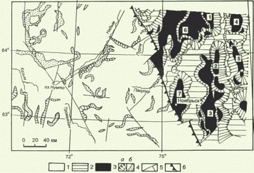 1 - области малоамплитудных поднятий и прогибов (плато); 2 - днища крупных прогибов (впадин); 3 - вершинные поверхности крупных поднятий (валов); 4 - высокоградиентные (а) и низкоградиентные (б) склоновые зоны, 5 – предполагаемые разломы, 6 – граница морфотектонических районов; цифры – основные поднятия (валы) Таркосалинской системы (таблица 1.1.1).
