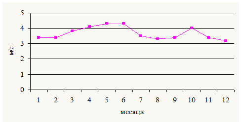 Рис.1.2.1. Средняя скорость ветра за год на станции Халясавей, м/с