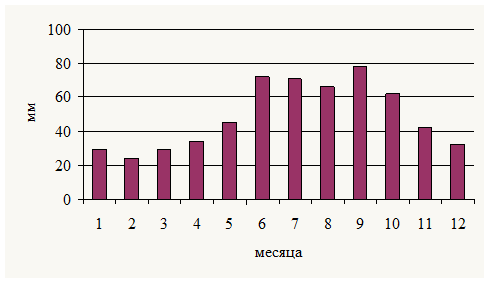 Высота Солнца над горизонтом на широте исследуемой территории в день летнего солнцестояния равна 50,2о. Наименьшая высота Солнца в день зимнего солнцестояния: 3,2о; в дни равноденствий она равна 26.7о. Годовая продолжительность солнечного сияния, в среднем, 1630 часов. Наибольшее число часов солнечного сияния отмечается в июле, наименьшее – в декабре. Весной число часов солнечного сияния в 2-3раза больше, чем осенью, что связано с годовым ходом облачности. В целом за год облачность снижает число часов солнечного сияния на 63%.