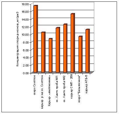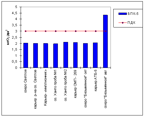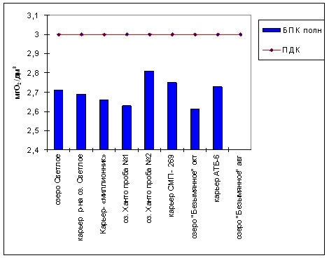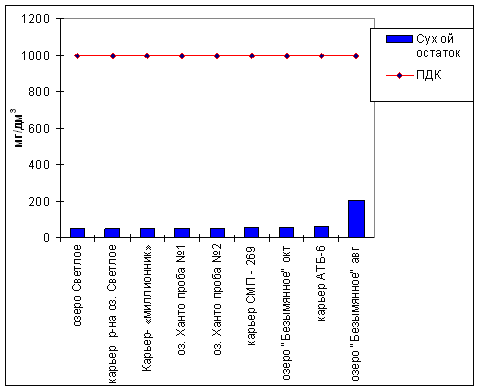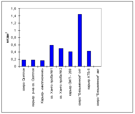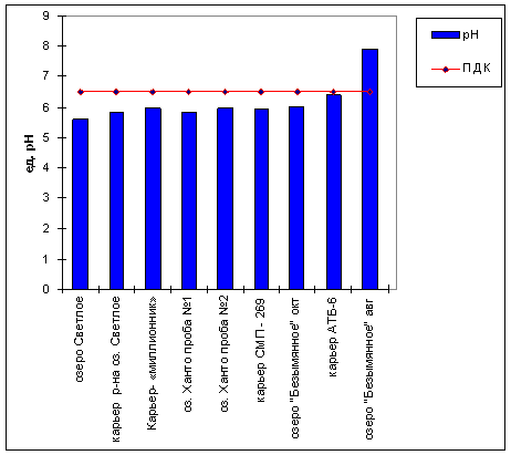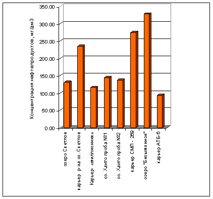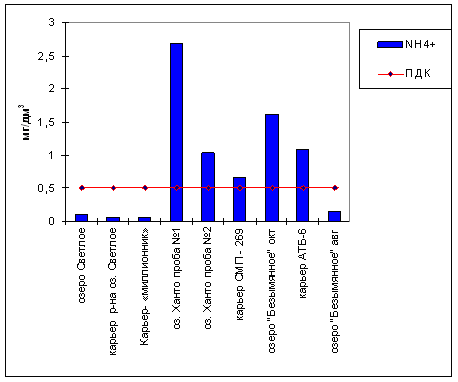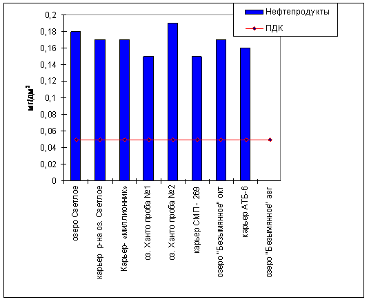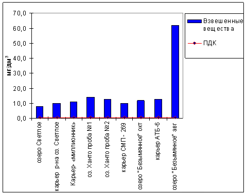 Практически во всех обследованных водных объектах наблюдается превышение по взвешенным веществам, содержанию нефтепродуктов, железа и марганца. В местах водовыпуска стоков – повышение содержания фосфатов (до 126 ПДК), хлоридов. Также имеется превышение по ионам аммония в оз. Ханто, карьерах СМП-269, АТБ-6, оз.Безымянное (непосредственно прилегающее к местам жилой застройки), что свидетельствует о загрязнении бытовыми сточными водами.