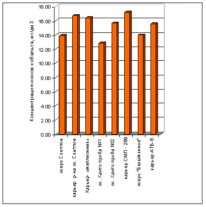 По результатам анализа образца озера «Безымянное» (район т.д. «Украина») - содержание кобальта – 13,95 мг/кг, никеля – 15,65 мг/кг, меди – 94,41 мг/кг, цинка – 30,96 мг/кг, мышьяка – 6,63 мг/кг, стронция – 103,87 мг/кг, свинца – 73,33 мг/кг, хлорид ионов – 9,38 мг/кг образца. Содержание нефтепродуктов составило 327,86 мг/кг. Данный образец имеет нейтральную среду. Результаты представлены также на диаграммах 3.2.2.20 – 3.2.2.25.