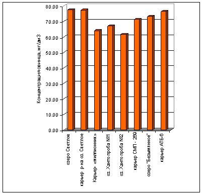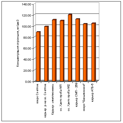 Во всех проанализированных образцах наблюдается превышение кобальта от 1,6 до 3,3 ПДК, никеля – от 3,1 до 4,4 ПДК. Самое высокое их содержание - в карьере СМП-269. Концентрация стронция в обследованных пробах - 89,35-109,58 мг/кг, что чуть выше почвенного фона. Максимальное содержание мышьяка – 4,6-5,5 ПДК - в донных отложениях, отобранных в оз.Светлое и прилегающем к нему карьере, в остальных случаях – от 3,3 до 3,8 ПДК. Содержание свинца находится на уровне 61- 77,5 мг/кг , что примерно в два раза превышает уровень установленных ПДК химических веществ в почве.