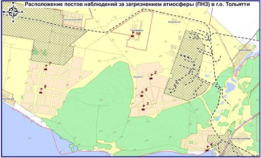Рис. 3. Расположение постов наблюдений за загрязнением атмосферы (ПНЗ) в г.о. Тольятти