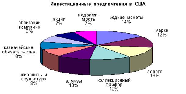 Как видно из графика, на ценные бумаги приходится около 25% инвестиций. Все виды инвестиций имеют свои достоинства и недостатки: например, для коллекционирования картин, фарфора, марок и монет необходимы экспертизы, много времени тратится на поиск связей среди коллекционеров. По сравнению с другими объектами инвестиций ценные бумаги занимают на рынке устойчивое положение. Главным их преимуществом является ликвидность — способность быстро получить деньги от их продажи. Также ценные бумаги можно отнести к наиболее доступному для американского населения и массовому средству вложения капитала, т.к. любой вкладчик может выбрать себе тот вид ценной бумаги, который для него наиболее привлекателен.