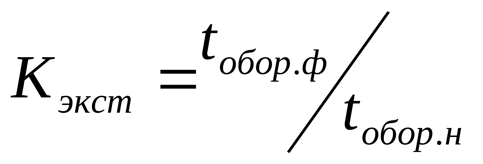 К показателям экстенсивного использования основных производственных фондов относятся коэффициент экстенсивного использования оборудования, коэффициент сменности работы оборудования, коэффициент загрузки оборудования. Коэффициент экстенсивного использования оборудования (Кэкст) определяется как отношение фактического количества часов работы оборудования (tобор.ф) к количеству часов его работы по норме (tобор.н) [15]: