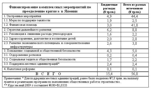 3.3. Комплекс стратегических мер поддержки экономики и выхода из кризиса будет финансироваться из государственных резервов путём перевода средств на специальные счета для реализации инвестиционных и кредитных программ. Реализация стратегических мероприятий по преодолению последствий кризиса и по обеспечению дальнейшего социально-экономического развития страны, со стороны Правительства будет поддержана бюджетными ассигнованиями примерно в объёме ¥15,4 трлн. ($169 млрд.), что в сумме с привлекаемыми частными капиталовложениями составит около ¥56,8 трлн. ($600 млрд.). Благодаря выполнению этих стратегических мер произойдёт оживление частного сектора, которое приведёт к устойчивой стабилизации финансовой сферы. Это позволит избежать негативных последствий кризиса и будет способствовать ускорению реализации стратегических планов экономического оздоровления страны с учётом изменяющейся ситуации на международном финансовом рынке. Принимаемые меры будут также препятствовать росту безработицы в обозримом периоде на внутреннем рынке труда. Важным результатом планируемых финансовых затрат является ожидаемым многократный положительный эффект. Так планируется, что принимаемые меры позволят увеличить в 2009 г. ВВП на 2% при одновременном увеличении примерно на 0,4-0,5 млн. числа рабочих мест в экономике страны. Планируется, что в период до 2011 г. в стране будет сохранено 1,0-1,9 действующих рабочих мест и будет создано примерно 1,4-2,0 млн. новых рабочих мест. Однако необходимо учитывать высокую волотильность глобальных финансовых рынков и неустойчивость развития экономик в других странах. Это может внести определённые коррективы в реализацию стратегических планов преодоления кризиса в стране. Дополнительные средства будут привлекаться за счет выпуска целевых облигационных займов, объём и периодичность выпуска которых будет определяться изменениями в экономических условиях. Кроме того, Правительство предоставляет гарантийные обязательства в размере ¥50 трлн. для поддержки фондового рынка.