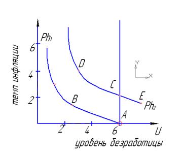 На рисунке 8 изображены построенные на краткосрочных временных интервалах две кривые Филлипса, каждой из которых соответствует своё значение ожидаемого темпа инфляции. Если ожидается, что инфляция будет отсутствовать, то кривая Филлипса займёт положение Ph 1. Точка пересечения этой кривой с горизонтальной осью показывает значение естественной нормы безработицы (в нашем случае 6%). Если в силу каких-либо причин фактически наблюдаемый темп инфляции поднимается до отметки 2% в год, то экономическая система переместится из точки А в точку В.
