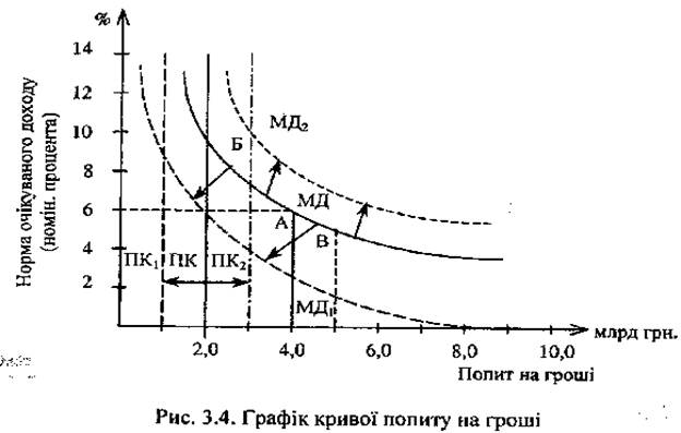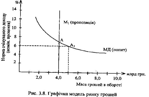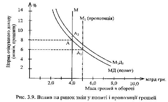 При незмінному попиті на гроші точка перетину кривих попиту і пропозиції зміститься вниз вправо по кривій МД у позицію A1 яка й визначить новий рівень рівноваги на грошовому ринку: ставка процента знизиться до 6%, маса грошей збільшиться до 5,0 млрд грн. Тільки за цих параметрів кон'юнктура грошового ринку стабілізується і встановиться нова рівновага попиту і пропозиції в точці A1.