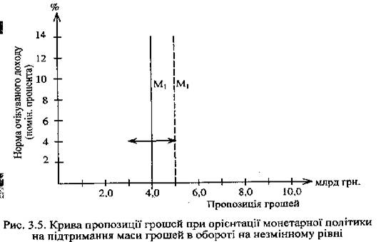 Пряма вертикальна лінія, проведена з точки 4,0, свідчить про те, що фактична пропозиція грошей склалася на рівні 4,0 млрд грн. і банківська система планує підтримувати її на цьому рівні незалежно від зміни процентної ставки. Якщо буде прийнято рішення за тих же умов збільшити пропозицію грошей до 5,0 млрд грн., то крива пропозиції зміститься вправо в точку, адекватну 5,0 млрд грн., але залишиться у вертикальному положенні, що свідчить про її незалежність від зміни процентної ставки.