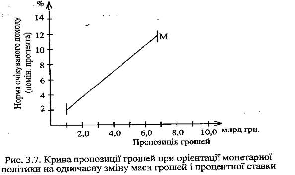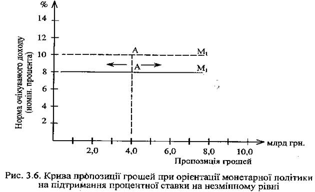 Горизонтальна лінія М1 проведена з точки 8, свідчить про те, що пропозиція грошей (точка А) повинна змінювати своє положення вліво чи вправо на горизонтальній прямій М1 (залежно від зміни попиту на гроші) так, щоб утримувати процентну ставку на рівні 8%. Якщо ж як ціль монетарної політики буде встановлено підтримання процентної ставки на рівні 10%, то лінія пропозиції грошей переміститься вверх у точку 10, але збереже горизонтальне положення.Зміщення пропозиції грошей (точка А) на обох рівнях у напрямку, потрібному для утримання ставки процента на незмінному рівні (8% чи 10%), центральний банк може забезпечити продажем цінних паперів на відкритому ринку (пропозиція грошей зменшиться) чи купівлею їх (пропозиція грошей збільшиться).Крива пропозиції грошей може набути вигляду нахиленої лінії, якщо грошово-кредитна політика передбачає збільшення маси грошей, проте меншою мірою, ніж це потрібно для збереження стабільного рівня процента. У такому разі одночасно змінюється і маса грошей, і норма процента, а крива пропозиції грошей займе положення, показане на рис. 6 .