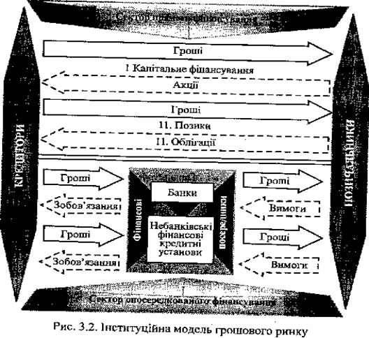 У загальному вигляді інституційну модель грошового ринку можна подати як схему потоків грошей та інструментів між трьома групами економічних суб'єктів: тими, що заощаджують гроші; тими, що запозичують гроші; фінансовими посередниками (рис. 7).