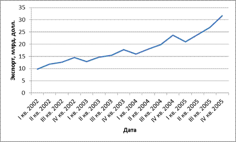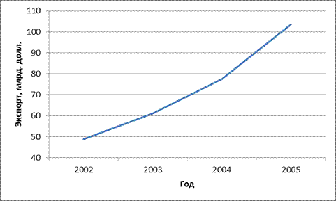 Экспорт товаров за 2002, 2003, 2004, 2005 годы (млрд.долларов США)