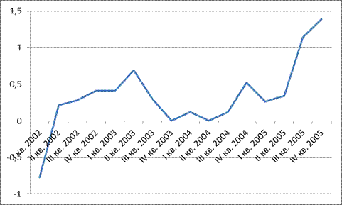 Экспорт товаров за кварталы 2002,2003, 2004 и 2005 годов