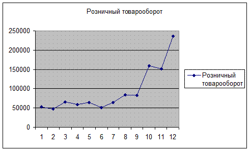 | Розничный товарооборот | 52043 | 47635 | 66031 | 59343 | 63930 | 51353 | 64250 | 84040 | 82967 | 158964 | 150721 | 235923 | 1117200 |