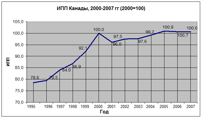 С 1995 года по 2000 год экономика Канады равномерно росла, без спадов. График 2 демонстрирует динамику ИПП Канады в 1995-2007 гг. (в млн. канадских долларов, здесь и далее доллар подразумевает канадский доллар).
