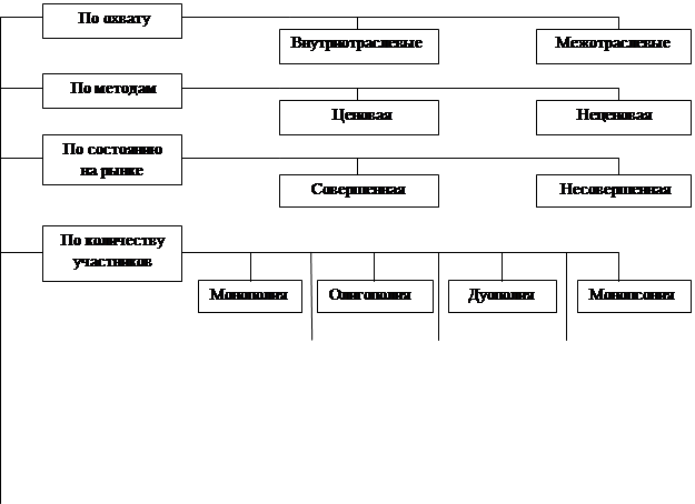 Таким образом, следуя анализу конкуренции, была составлена схема классификаций конкуренции (схема.1) и таблица характеристики рыночных структур по различным показателям(табл.1).