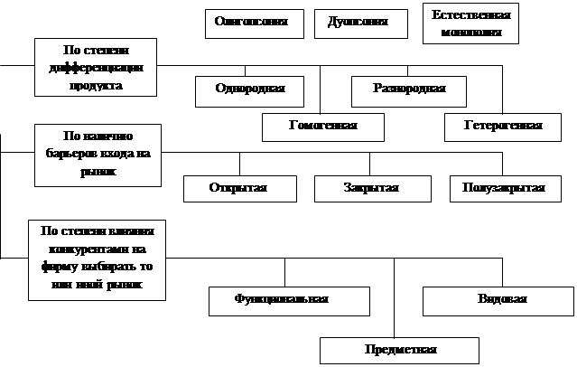 Монополистическая конкуренция делится на монополию, олигополию, дуополию, монопсонию, олигопсонию, дуопсонию, монополистическую конкуренции с дифференциацией продукта и естественную монополию.