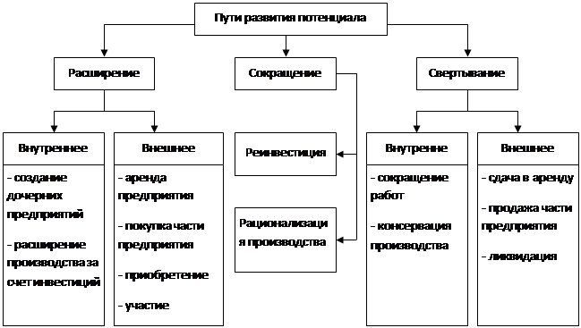 Выбор направления или стратегии развития потенциала предприятия зависит в основном от состава, структуры и качества имеющихся экономических ресурсов, уровня конкурентоспособности производимых работ и услуг, существующего положения на рынке и предстоящих целей, например, выйти в лидеры, закрепиться среди конкурентов, избежать банкротства и т.п.