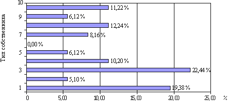 Типы собственников — владельцев контрольных пакетов: 1 — государство; 2 — работники; 3 — сторонние физические лица; 4 — генеральный директор; 5 — банки; 6 — инвестиционные фонды; 7 — группа компаний; 8 — независимые юридические лица; 9 — иностранные инвесторы; 10 — прочие