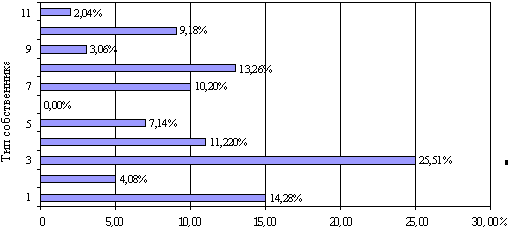Типы собственников — владельцев контрольных пакетов: 1 — государство; 2 — работники; 3 — сторонние физические лица; 4 — генеральный директор; 5 — банки; 6 — инвестиционные фонды; 7 — группа компаний; 8 — независимые юридические лица; 9 — иностранные инвесторы; 10 — прочие; 11 — нет реального доминирования