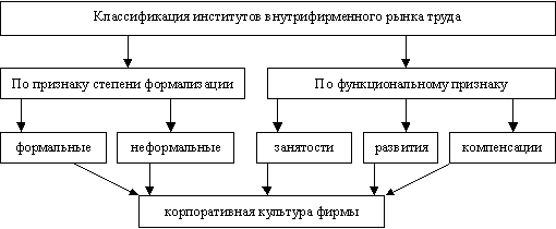 Основным институтом, системообразующим фактором внутрифирменного рынка труда является корпоративная культура предприятия. Корпоративная культура отражает специфичность действующих институтов занятости, развития и компенсации как в формальном, так и в неформальном аспектах.