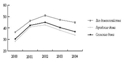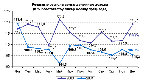 В 2004 г. в РФ произошло замедление роста денежных доходов населения, причем снижение темпов роста оказалось весьма значительным. Это касается как динамики номинальных, так и реальных показателей. Однако следует признать, что в целом сохранение положительной тенденции к росту реальных денежных доходов населения, наблюдающейся в последние годы, все-таки свидетельствует об определенном улучшении уровня жизни российских граждан. За период 2002-2004 гг. реальные располагаемые денежные доходы возросли, на 36,1%. При этом реальная средняя назначенная пенсия за последние 4 года увеличилась почти в 2 раза.