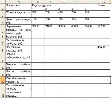 Переменные расходы1=SПостоянные расходы/Количество видов продукции=41400/5=8280;