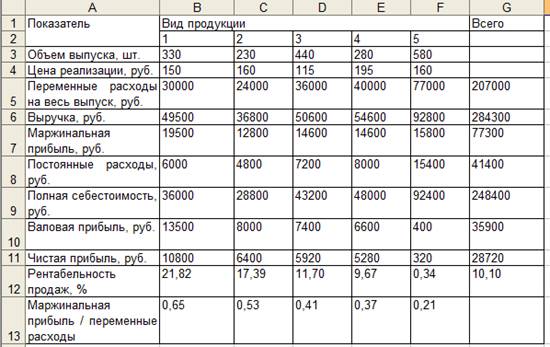 Анализ должен быть проведен по методу полных издержек (с распределением постоянных затрат пропорционально переменным) и по методу прямых издержек.