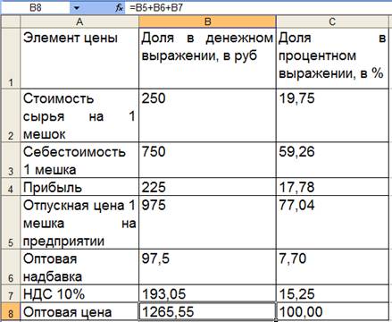 Для сахарного завода стоимость закупаемого сырья для производства сахара 5 руб./кг. Себестоимость 1 кг – 15 руб., приемлемая норма прибыли – 30% себестоимости. Сахар реализуется с оптовой базы в мешках по 50 кг, оптовая надбавка 10%. Состав структуры одного мешка сахара.