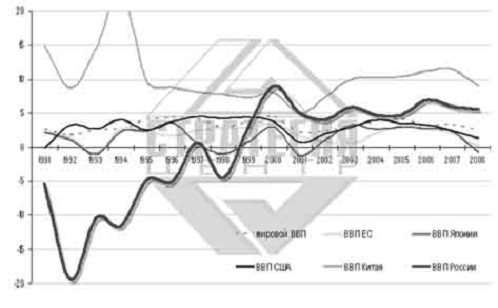 Рис.2.2 Динамика ежегодного прироста ВВП мировой экономики, стран Еврозоны, США, Японии, Китая и России в 1991-2008 гг. [21, с.45]