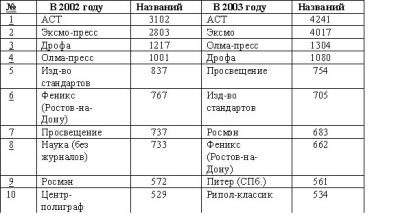 Бесспорно, одним из характерных явлений формирования книжного рынка России является его монополизация узким кругом издательств и издательских корпораций, чрезмерно высокий уровень концентрации книжного бизнеса. Достаточно отметить, что, по данным статистики за 2003 год, только 5 крупных издательств (из более чем 6 тысяч издательств, организаций и частных лиц!) – АСТ, Эксмо, Просвещение, Олма-пресс и Дрофа – выпускают 13 % названий книг в стране и свыше 30 % от общего тиража!