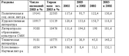 Изменения по отраслям и тематике с 1991 по 1999 годы выглядят так. Политическая и социально-экономическая литература вдвое сократилась по числу изданий и втрое – по тиражам; естественно-научная – в полтора раза по числу изданий и почти вчетверо по тиражу. Наибольшее падение тиражей наблюдается в издании технической литературы – в семь раз! Однако и в области искусства тираж изданных книг упал в 6 раз – с 660 до 102 тыс. экз., в области культуры и образования – в 3,5 раза – с 797 до 324 тыс. экз. Резко возросло издание переводной литературы – с 3763 до 5809 названий, хотя тиражи все же (за этот период) сократились. Основными из издаваемых переводных книг стали переводы с английского. Следующие за ними по численности изданий переводы с французского и немецкого, вместе взятые, уступали переводам с английского в несколько раз. Приведенные данные свидетельствуют о трудных процессах формирования книжного рынка России в 90-е годы. Статистика самых последних лет (см. ниже) свидетельствует о начале стабилизации российского книгоиздания в начале в XXI веке.