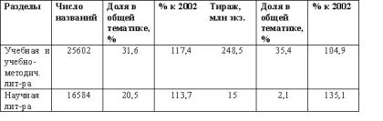 Выпуск книг по числу изданий и тиражу по разделам в 2003 году