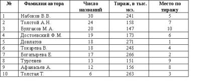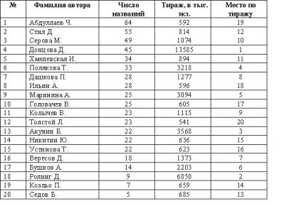 Любопытно и показательно с точки зрения изучения конъюнктуры книжного рынка рассмотреть издание книг по авторам. Приведем перечень 20-ти самых издаваемых авторов в России на 2002 год по числу названий в убывающем порядке с указанием тиража (с округлением до 1 тыс. экз.) и места в этой же двадцатке по тиражу: